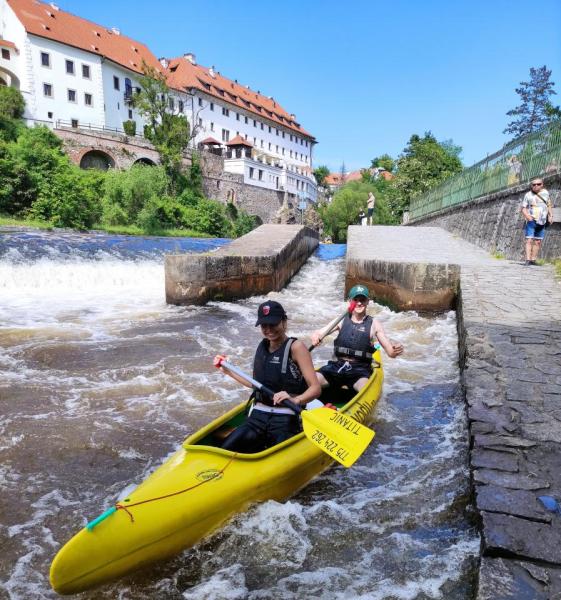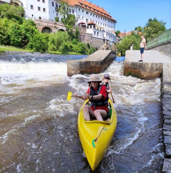 Někteří z nás ještě nikdy v kánoi nepluli, a tak byli trochu nervózní, hlavně, když následujícího dne sjížděli svůj první jez, přesto všichni sebrali odvahu jej sjet, a ač do dalšího kepmu dorazila část třídy mokrá, měli jsme všichni zase o zkušenost víc. Třetího dne, tedy v pátek, nás čekala prohlídka jednoho z nejkrásnějších měst v republice - Českého Krumlova. Jen se tam dostat přes kaskádu jezů - odvážlivci zkoušeli splout i Lyru, nejtěžší z jezů po cestě. Ať už se cvakli nebo ne, odplouvali se zážitkem (a většinou i spoustou vody v lodi).